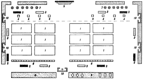 14. Клуб полка располагается на участке местности, позволяющем удобно разместить открытую сцену, места для зрителей и клубные павильоны.