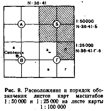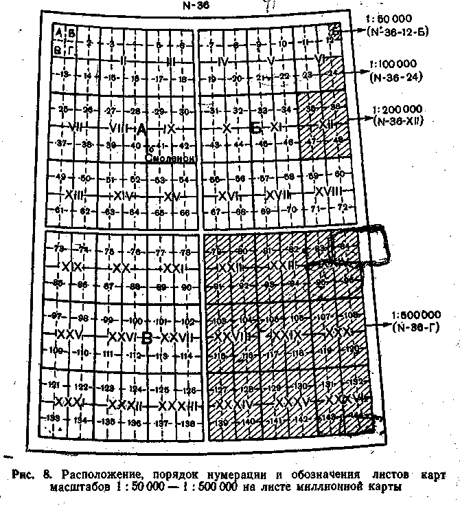 Например, N-36-41-8 обозначает лист масштаба 1:50000, а N-3641-В-а - лист масштаба 1:25000 с г. Смоленск.