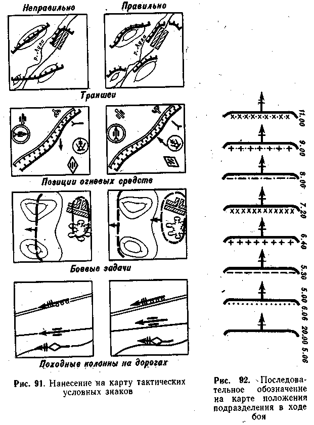 Контурные и линейные условные знаки при нанесении на карту нужно согласовывать по начертанию- с рельефом и контурами местных предметов, вдоль которых они расположены - (опушками леса, конфигурацией окраин населенных пунктов, береговых линий), обязательно показывая направления действий и ведения огня. Условные, знаки походных колонн следует наносить рядом с условными знаками дорог (рис. 91).