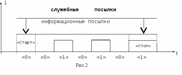 В реальных условиях как правило, в состав кодовой комбинации, кроме информационных посылок, т.е. тех, с помощью которых непосредственно кодируются символы, входят также служебные посылки, необходимые для обеспечения работы оконечных телеграфных устройств (ОТУ). Так, в старт-стопных телеграфных аппаратах это стартовая - бестоковая и стоповая - токовая посылки. Таким образом, в целом кодовая комбинация содержит семь двоичных импульсов, см. рис.2, из которых пять - информационных и два служебных.
