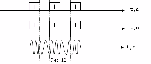 Скорость передачи однозначно связана с частотой следования двоичных импульсов - F . Как известно, если период одного полного синусоидального колебания - Т составляет 1 сек. частота его F = 1Гц. На этом же периоде, см. рис 3, могут быть уложены два двоичных импульса (положительной и отрицательной полярностей) с длительностями, равными Т/2.