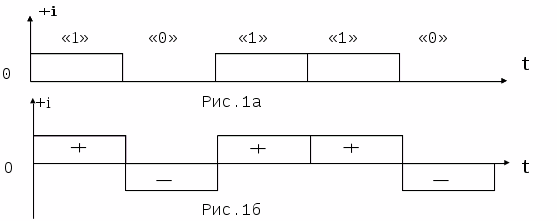 Под посылкой понимается элементарный сигнал длительностью . Сигналы, состоящие из однополярных, рис.1а, или двухполярных, рис.1б, посылок называются сигналами постоянного тока. Минимально необходимое число посылок в кодовой комбинации - n - определяется объемом алфавита - (количеством символов) - N . и находится с помощью выражения