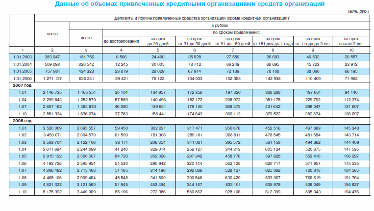 Октябрь 2008 г. стал худшим месяцем для российских банков: вкладчики забрали с депозитов рекордную сумму 354 млрд руб., еще 154 млрд. руб. банки потеряли на фондовом рынке. Чтобы удержаться на плаву, кредитным организациям пришлось занять у ЦБ беспрецедентно большую сумму – 1,2 трлн. руб. В октябре кредитные учреждения заняли у Банка России 1,178 трлн. руб., что по объему соответствует порядка трети собственного капитала всех российских банков. Месяцем ранее банки заняли 233 млрд. руб.