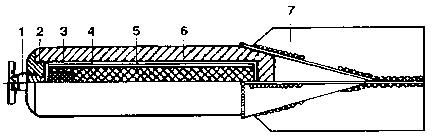 3 - детонаторная шашка; 4 - корпус; 5 - бугель; 6 - взрывчатое вещество; 7- бугель дополнительный; 8 - соединительное кольцо; 9 - конус;