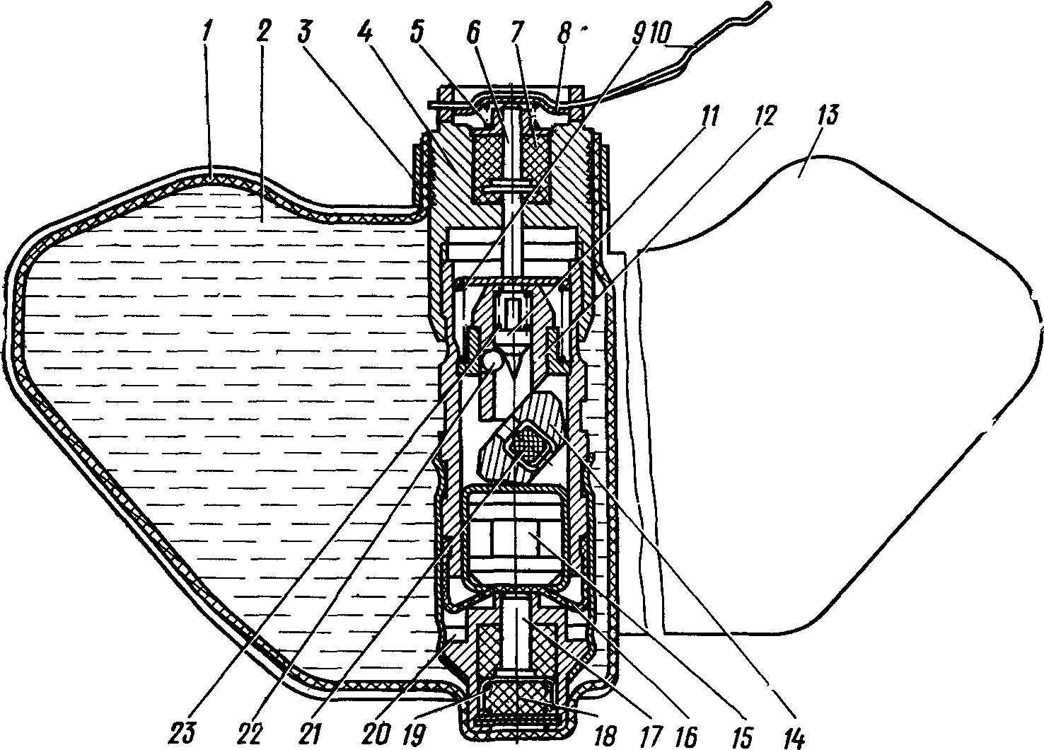 после установки мины, вода попадает к сахарной шашке и растворяет ее, при этом шток под действием пружины выходит из медной трубочки и мина переходит в боевое положение.
