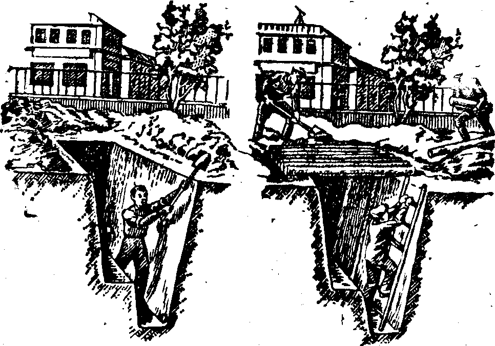 В слабых грунтах устраивается, как правило, одежда крутостей из различных материалов (доски, жерди, фашины из хвороста, соломы или камыша и др.). Вход должен располагаться под углом 90° к продольной оси. укрытия. На дне отрывается водосборная канава. Настилается пол и ставятся нары. У входа отрывается водосборный колодец (глубиной до 50 см), а в противоположном от входа торце устанавливается вентиляционный короб или простейший вентилятор.