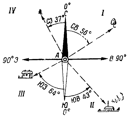 На рис. 20 показаны дирекционные углы в данной точке О (полюс) на ветряную мельницу (а =45°) и отдельное дерево (а =315°).
