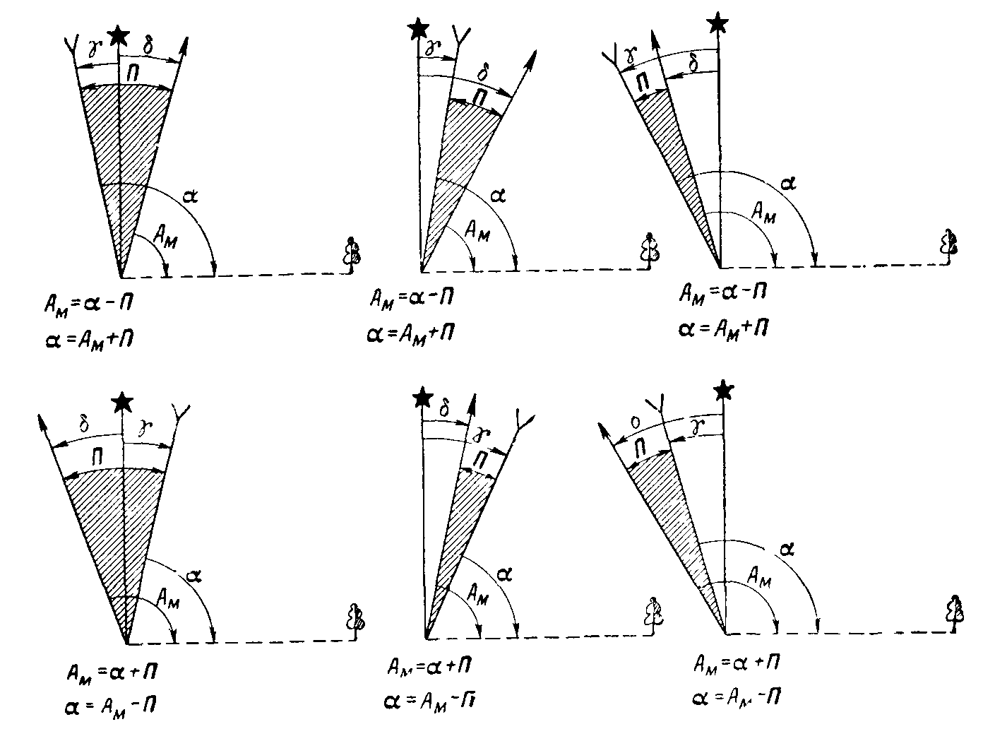 Чтобы яснее представить себе при работе на карте переход от дирекционных углов к азимутам и обратно, рассмотрим рис. 16, на котором показаны шесть основных случаев взаимного расположения направлений магнитного меридиана и вертикальной линии координатной сетки относительно истинного меридиана. Как видно из рисунка, для всех этих случаев зависимость между различными углами можно представить в виде следующих общих алгебраических формул: