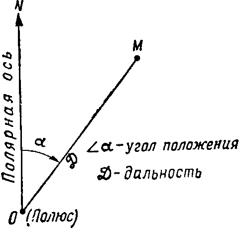 а) углом NOM=a, который называется углом положения и измеряется от направления полярной оси до направления на определяемую точку М;