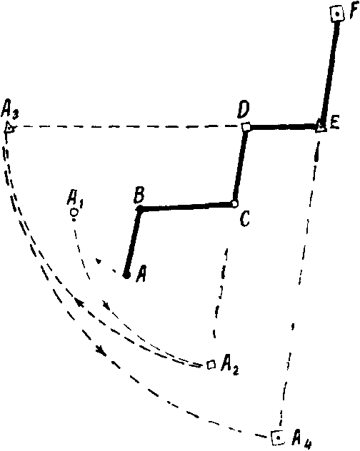 Для измерения извилистой линии шаг циркуля берется меньше (например, 0,5 см или 1 см), сообразно длине звеньев линии. Но более удобно измерение вести следующим образом (рис. 4). Пусть требуется измерить по карте расстояние по линии ABCDEF. Установив раствор циркуля по первому звену линии, т. е. по АВ, переставляем заднюю ножку в точку А>1> (на продолжении следующего по ходу измерения звена ВС). Оставляя ее теперь на месте, т. е. в точке А>1>, увеличиваем раствор циркуля перемещением передней его ножки в точку С. Затем, не изменяя положения передней ножки, заднюю из точки А>1> переставляем в точку А>2> (на продолжении третьего звена CD). После этого переднюю ножку перемещаем дальше в точку D и т. д., пока не пройдем таким образом всю линию. В итоге получим отрезок A>4>F, равный искомой длине линии на карте. Остается, не изменяя полученного раствора циркуля, перенести его на линейный масштаб или миллиметровую линейку и определить расстояние, как было указано выше.