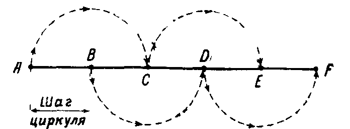 Измерение длинных линий, не умещающихся на линейном масштабе карты, производится по частям. Для этого берут по масштабу раствор циркуля, соответствующий какому-нибудь целому числу километров или метров, и таким «шагом» проходят по карте определяемое протяжение, ведя счет перестановок ножек. Наиболее рациональный порядок перестановки ножек показан на рис. 3, где AF—измеряемая линия, А, В и т. д.—места постановки ножек. Стрелками показано направление перемещения ножек.