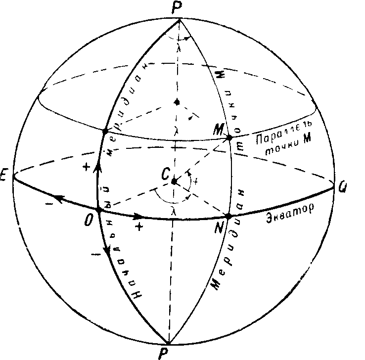 Географической долготой называется угол между плоскостью меридиана данной точки и плоскостью меридиана, условно принятого за начальный. Географическую долготу обычно обозначают греческой буквой (ламбда). Угол OCN (рис.6) будет долготой точки М. Как уже указывалось, у нас за начальный принят Гринвичский меридиан. Долготы отсчитываются по дуге экватора или параллели в обе стороны от начального меридиана, начиная с 0° до 180°. Долготы к востоку от начального меридиана до 180° называются восточными, а к западу—западными. Все точки, лежащие на одном меридиане, имеют одинаковую долготу.