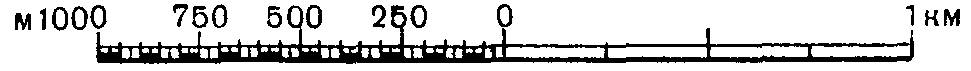 При пользовании численным масштабом расстояния на карте измеряют в сантиметрах обычно при помощи линейки с сантиметровыми делениями. Полученное при этом число сантиметров умножают на величину масштаба. Например, па карте масштаба 1:50000 измерено 3,8см; на местности это будет соответствовать Д=3,8х0,5=1,9 км. Если же расстояние Д измерено на местности и треб\е1ся отложить его на карте, то следует Д разделить на величину масштаба карты. Например, если Д=1350 м, то на карте масштаба 1:25000 надо отложить отрезок d = 1350-250=5,4 см.