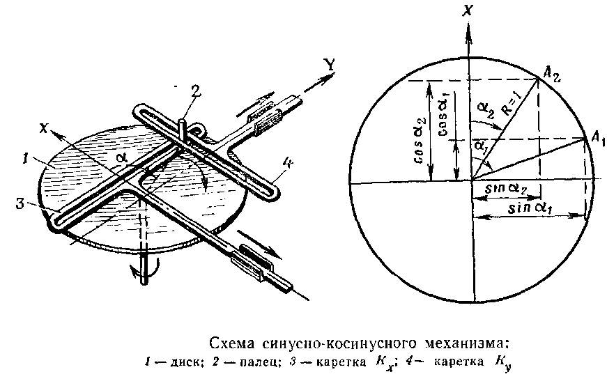Синусно-косинусный механизм автоматически определяет численные значения синуса и косинуса дирекционного угла направления движения машины. Он представляет собой поворачивающийся диск, на котором укреплен палец, связанный с двумя каретками К>х> и Ку. В целях ввода корректуры пути расстояние между центром диска и пальцем может меняться.