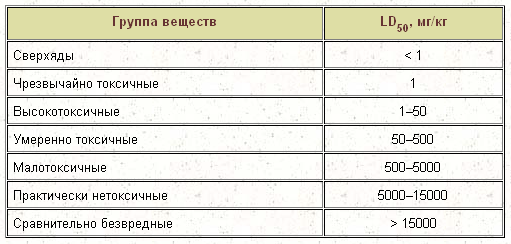 На основании величин летальной дозы возможна классификация ОВ по токсичности. В этой классификации используются данные, полученные в опытах на крысах при однократном введении через рот: