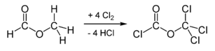 Один из возможных методов получения состоит в полном хлорировании метилформиата под ультрафиолетом: