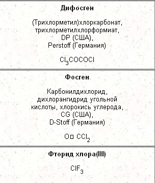 Широко используют в промышленности и хозяйственной деятельности классические удушающие вещества: фосген, хлор, хлорпикрин. Особенно велики запасы хлора.