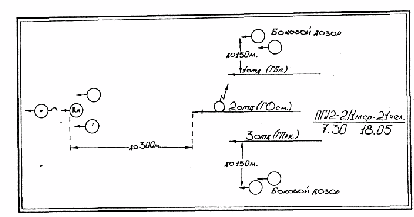 Азимут поиска 280°. Боевой порядок – цепь с интервалом 10 метров между военнослужащими и с выдвинутым вперед на 410 м дозором с патрульно-розыскной собакой. Начало поиска 7.30, конец поиска 11.30, темп поиска – 1000 м/час. Уравнительные рубежи: № 1 – просека с высоковольтной линией, пройти в 9.00, № 2 – лесная дорога, овраг – в 10.20, на конечный рубеж – западная опушка леса, выйти к 11.30.