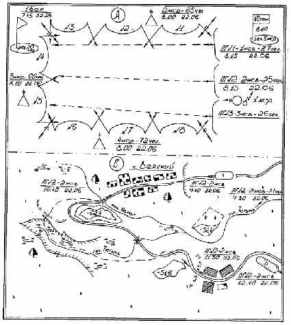 Исходный рубеж для поиска: слева – изгиб полевой дороги, справа – мост через ручей «Игривый» занять к 7.15, готовность к поиску 7.25. С началом поиска я с резервом перемещаюсь за 2-м мсо.Направо, на исходный рубеж, шагом – МАРШ».