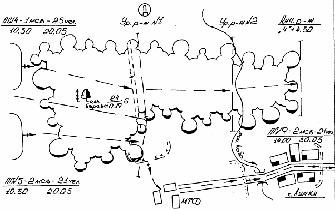 Если в результате первого осмотра местности преступники не обнаружены (обнаружены не все), то поиск организуется повторно в обратном направлении с конечного рубежа или с рубежа встречи на исходный рубеж. Рис.6.