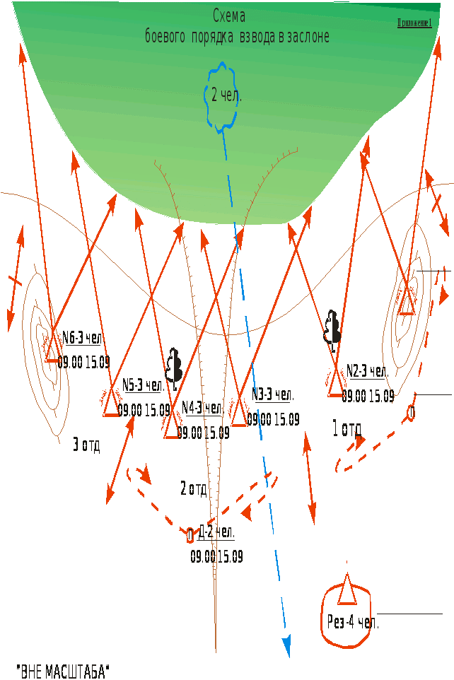 2 мсо к 15.00. 20.10. блокировать рубеж: отдельно стоящее дерево - редколесье, выставить три наблюдательных поста. Полоса наблюдения и ведения огня: справа отдельно стоящее дерево – яма; слева редколесье – мачта; дополнительный сектор обстрела – редколесье - карьер.