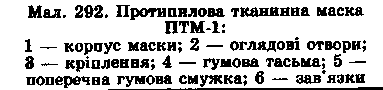 Протипилова тканинна маска (рис. 1) складається з двох частин — корпусу і кріплення. Корпус маски шиють з 4—5 шарів тканини. Зовнішні шари роблять з тканини без ворсу, а внутрішні — для кращої фільтрації — з ворсом. Кріпленням служать смужки тканини, пришиті збоку корпуса. Маски виготовляються семи розмірів, відповідно до висоти обличчя: до 80 мм — перший розмір, 80—90 мм — другий,