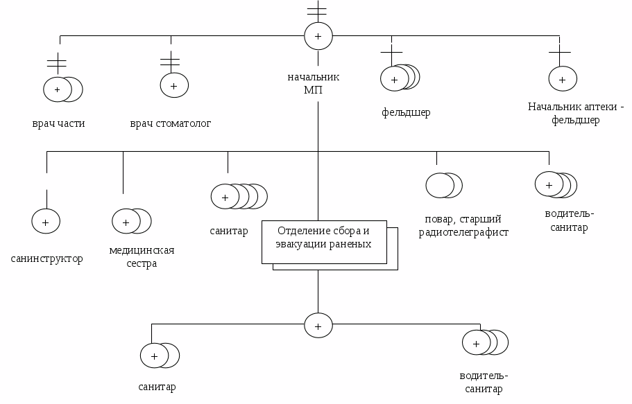 Состав МПп: начальник МП - 1, врачи -2, врач-стоматолог-1, фельдшер-3, начальник аптеки -фармацевт - 1, санитарный инструктор - 3, медицинская сестра-2, санитар-4, повар-1, старший радиотелеграфист-1, водитель-электромеханик-1, старший водитель-1, водитель-санитар-1; всего 22 человека. Кроме того, в состав МП входит отделение сбора и эвакуации раненых; командир отделения -санитарный инструктор-2, старший водитель-2, водители-санитары-4, санитары-4; всего 12 человек.