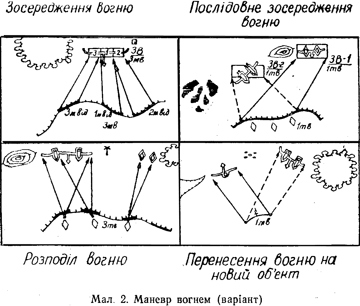 Ураження противнику може наноситися вогнем окремих вогневих засобів або зосередженим вогнем відділення і взводу.[7]