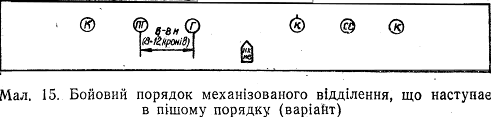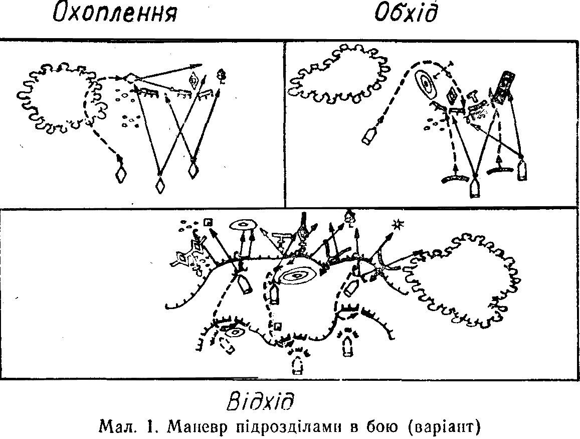 13. У бою взвод (відділення, танк), використовуючи вигідні умови місцевості, повинен уміло поєднувати вогонь з просуванням і широко застосовувати маневр. Маневр проводиться силами і засобами, а також вогнем.