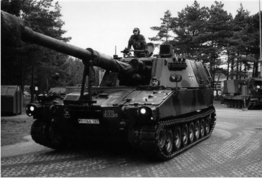 Полевая артиллерия. Подразделения полевой артиллерии входят в состав всех наземных боевых сил. Например, пехотная дивизия имеет в своем составе дивизион буксируемых 105-мм гаубиц (всего 54) и один смешанный дивизион из четырех 203,2-мм самоходных гаубиц и восемнадцати буксируемых 155-мм гаубиц, а также батарею артиллерийской инструментальной разведки (АИР). Бронетанковые и воздушно-десантные дивизии также имеют в своем составе артиллерийские дивизионы сходной организации. Следующим тактическим соединением является армейский корпус, образуемый одной или несколькими дивизиями. Его артиллерия состоит из батареи АИР и дивизионов 155- и 203,2-мм гаубиц и ракетных систем "Ланс". Следующим и высшим оперативным объединением является полевая армия. Для оказания огневой поддержки своим корпусам она располагает оружием большой дальности, таким, как управляемые ракеты "Першинг I" с дальностью стрельбы 640 км.