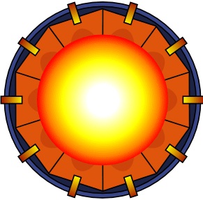 Нейтронный инициатор - шар диаметром порядка 2 см из бериллия, покрытый тонким слоем сплава иттрий-полоний или металлического полония-210 - первичный источник нейтронов для резкого снижения критической массы и ускорения начала реакции. Срабатывает в момент перевода боевого ядра в закритическое состояние (при сжатии происходит смешение полония и бериллия с выбросом большого количества нейтронов). В настоящее время помимо данного типа инициирования, больше распространено термоядерное инициирование (ТИ). Термоядерный инициатор (ТИ). Находится в центре заряда (подобно НИ) где размещается небольшое количество термоядерного материала, центр которого нагревается сходящейся ударной волной и в процессе термоядерной реакции на фоне возникших температур нарабатывается значимое количество нейтронов, достаточное для нейтронного инициирования цепной реакции (рис.3.).