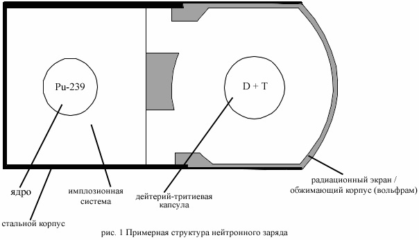 Нейтронный заряд конструктивно представляет собой обычный ядерный заряд малой мощности, к которому добавлен блок, содержащий небольшое количество термоядерного топлива (смесь дейтерия и трития с большим содержанием последнего, как источника быстрых нейтронов). При подрыве взрывается основной ядерный заряд, энергия которого используется для запуска термоядерной реакции. При этом нейтроны не должны поглощаться материалами бомбы и, что особо важно, необходимо предотвратить их захват атомами делящегося материала.