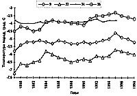 В качестве наглядного примера происходящих термических изменений в криолитозоне используем данные наблюдений стационара Марре-Сале (Западный Ямал), расположенного на участке одноименной метеостанции. Здесь почти на всех экспериментальных площадках зафиксировано повышение температуры мерзлых пород на глубине 10 м за 1979-1998 годы (рис. 3).
