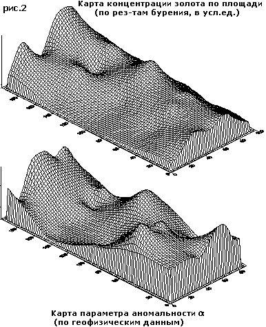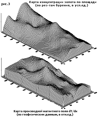 Следует отметить, что на этой площади в шлихе очень много магнетита, который ассоциирует с россыпным золотом. Видимо в результате этой связи, прослеживается достаточно четкая корреляция между содержанием золота и геофизическими параметрами, в особенности с параметром a (электромагнитной аномальностью). Корреляция с первой производной полного вектора магнитного поля (dT/dx) менее показательна, однако и здесь можно уловить вилообразную форму залежи. Максимальные содержания золота приурочены к западинам плотика, которые неплохо выделяются на карте сопротивлений (см. выше). Последующая отработка подтвердила эти данные.