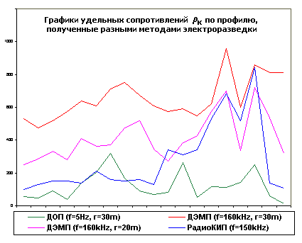 Проводя съемку на двух и более частотах можно судить об изменении электросопротивления с глубиной, вплоть до построения качественных геоэлектрических разрезов.