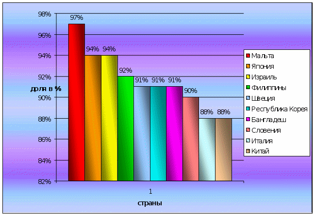 Страны, доля которых превышает 74%, относятся к 1 рангу.