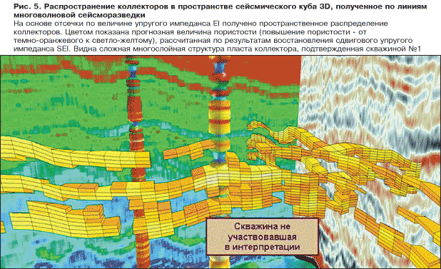 Все вышеперечисленные преимущества многоволновой регистрации точечными датчиками очевидны и общепризнанны. Опыт практического применения данной технологии в условиях Западной Сибири доказывает ее эффективность в реальных условиях. Включение результатов работ в объемную геологическую модель месторождения показывает, что в этом случае уточняются параметры продуктивных резервуаров и ожидается повышение эффективности разведки и разработки залежей углеводородов (рис. 5).