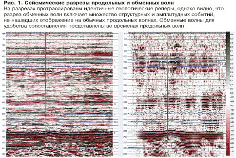 Разрезы разных типов волн отображают несколько различные свойства геологической среды, поэтому формирующиеся волновые пакеты отличаются даже при оптимальных для каждого типа волн условиях наблюдения. Добавление в анализ сдвиговой компоненты увеличивает информативность регистрируемого сейсмического волнового поля. В нем проявляются новые, не видимые в области РР-волн геологические объекты, а видимые объекты включают дополнительные кинематические и динамические характеристики (рис. 1).