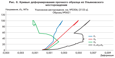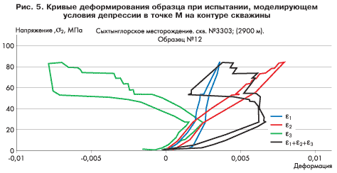Образцы породы, изготовленные из предоставленного кернового материала, были испытаны на ИСТНН по программе нагружения, описанной выше. При моделировании депрессии в скважине (участок ВС на рис. 3) шаг догружения образцов соответствовал увеличению депрессии в скважине на 25 атм. Часть образцов была испытана при Р0, равном гидростатическому давлению на данной глубине, а остальные образцы — при АВПД, равном 1,4 и 1,7.