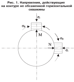 На рис. 1 схематично показано сечение горизонтальной не обсаженной скважины и действующие на стенках скважины радиальное σR и кольцевое σθ напряжения в двух точках M и N.