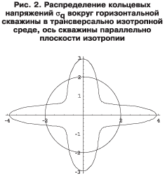 Это в полной мере относится и к ГС, бурящимся в пластах с ярко выраженной анизотропией деформационных свойств породы. Однако подход к моделированию напряженно-деформированных состояний, возникающих вокруг ГС в трансверсально-изотропном пласте, значительно отличается от того, который обычно применяется для случая вертикальных скважин. Это связано с тем, что в случае вертикальной скважины все точки на ее контуре абсолютно идентичны с точки зрения действующих в них напряжений как для изотропного, так и для трансверсально-изотропного пласта. В горизонтальной же скважине дело обстоит иначе. Если в случае изотропного пласта действующие напряжения также постоянны по контуру скважины, то при наличии анизотропии напряжения существенно меняются по контуру скважины и зависят от упругих характеристик породы.