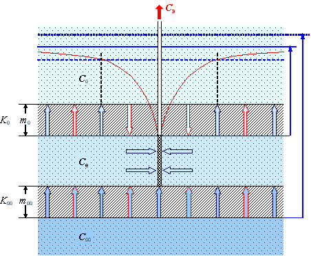 - смежные горизонты: в общем случае, тоже проводимость и пьезо(уровне)проводность или водоотдача, потому что в ходе разведки далеко не всегда можно уверенно заключить, какую схему принимать для прогноза (с постоянным или понижающимся уровнем в смежных горизонтах)
