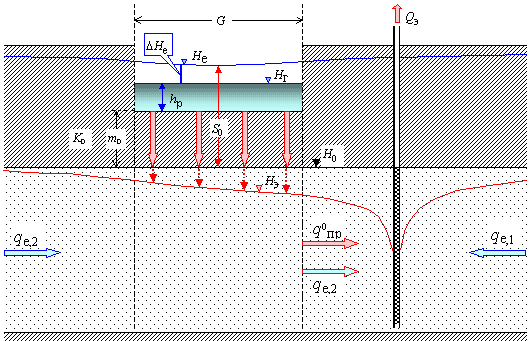 в) режим фильтрации - стационарный, т.е. дебит водоотбора полностью обеспечивается изменениями трансграничного расхода на контуре реки.