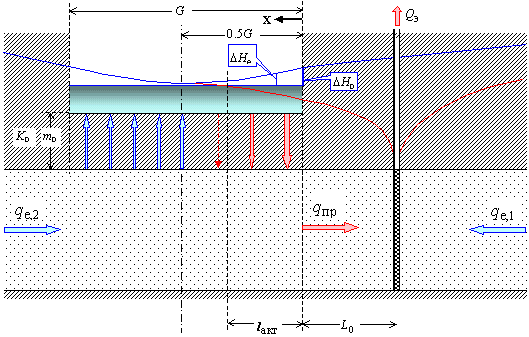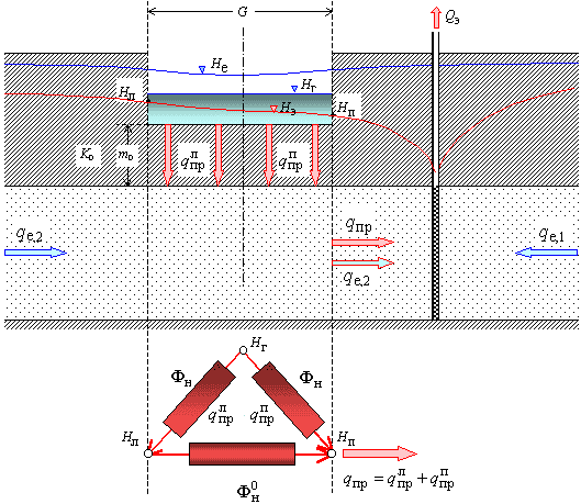 Рис. 7.5. Балансово-гидродинамическая схема работы водозабора в условиях отрыва уровней от подошвы подруслового экрана |