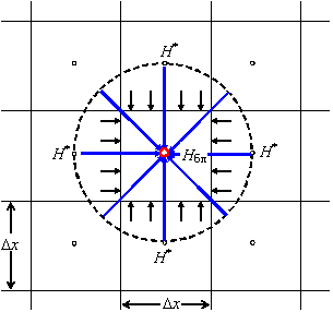 Рис. 3. Характер притока к водозаборной скважине в РЕАЛЬНОМ (синие стрелки) фильтрационном потоке и на СЕТОЧНОЙ МОДЕЛИ (черные стрелки) |