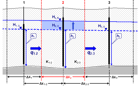 Рис. 1. К обоснованию методики оценки интенсивности инфильтрации по данным режимных наблюдений на створе скважин в линейном потоке |