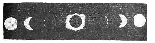 Если видимый диаметр Луны оказывается значительно больше 'видимого диаметра Солнца, то мы будем иметь более продолжительное полное затмение, если же видимый диаметр Луны очень мало отличается от диаметра Солнца, но всё же больше него, то полное затмение будет очень кратковременным. Однако, может оказаться, что видимый диаметр Луны будет меньше видимого диаметра Солнца, и тогда при наибольшем покрытии диска Солнца наблюдатель увидит только узенькое яркое колечко, а вся остальная поверхность Солнца будет заслонена Луной. Такое затмение называется кольцеобразны м. Наконец, расположение Солнца и Луны может оказаться таким, что на Земле (произойдёт лишь частное затмение. В этом случае степень покрытия Луной Солнца сначала возрастает до известного предела, наступает наибольшая фаза затмения, после чего Луна начинает сходить с Солнца, не закрыв его полностью.