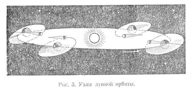 За время своего месячного оборота вокруг Земли Лупа дважды пересекает плоскость земной орбиты в точках, расположенных на линии узлов. Направление линии узлов, соответствующее точке, в которой Луна поднимается к северу от эклиптики, называется направлением восходящего узла; противоположное направление, где Лупа опускается к югу от эклиптики, называется направлением нисходящего узла. Так как Земля движется вокруг Солнца, плоскость лунной орбиты перемещается в пространстве параллельно самой себе. Поэтому и линия узлов, проходящая всегда через Землю, будет перемещаться в плоскости земной орбиты параллельно самой себе, й тогда, как это видно из рис. 3, линия узлов дважды в год будет обращена к Солнцу: один раз направлением восходящего узла, другой раз направлением нисходящего узла.