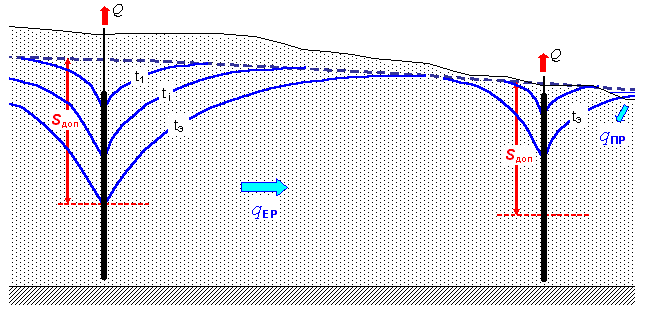 ПРИ ЭКСПЛУАТАЦИИ: водоотбор - новая расходная статья баланса (искусственная разгрузка). Поэтому после включения водозабора начинает формироваться (в полном соответствии с законами систем материального мира) новое равновесное балансовое состояние, т.е. происходят количественные изменения естественных балансовых процессов, стремящиеся компенсировать возникший за счет водоотбора дисбаланс. В совокупности эти изменения таковы: