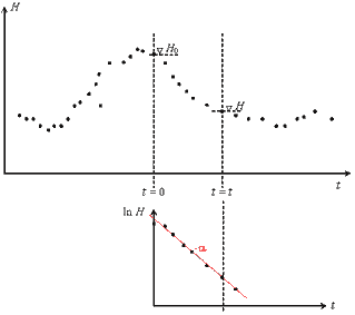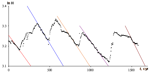 Если проанализировать длинный режимный ряд в таких координатах (рис. 2.4), то на нем хорошо видны прямолинейные участки, имеющие максимальную крутизну - это и есть периоды "независимого спада". Остальные, более пологие участки спада уровней, видимо, еще происходят на фоне слабеющего питания (так сказать, "зависимый спад").